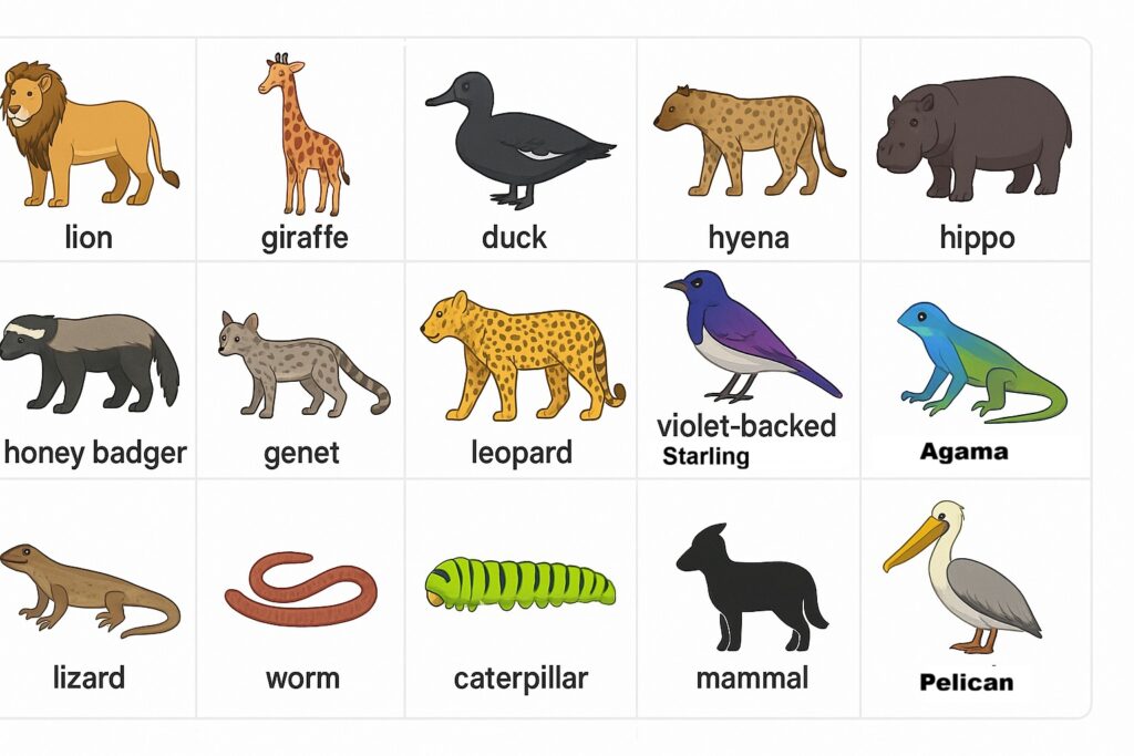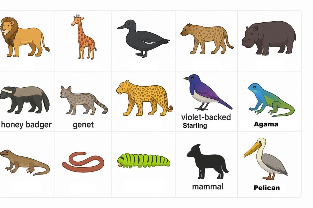 African bush – the wild, natural land in Africa where many animals live. “The African bush has tall grass, trees, and animals like lions, elephants, and giraffes.”