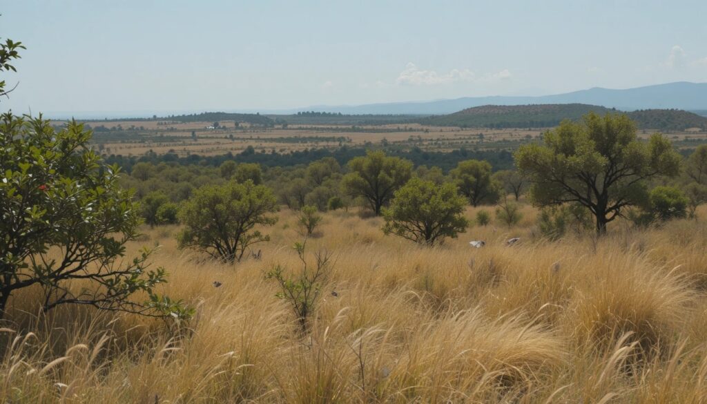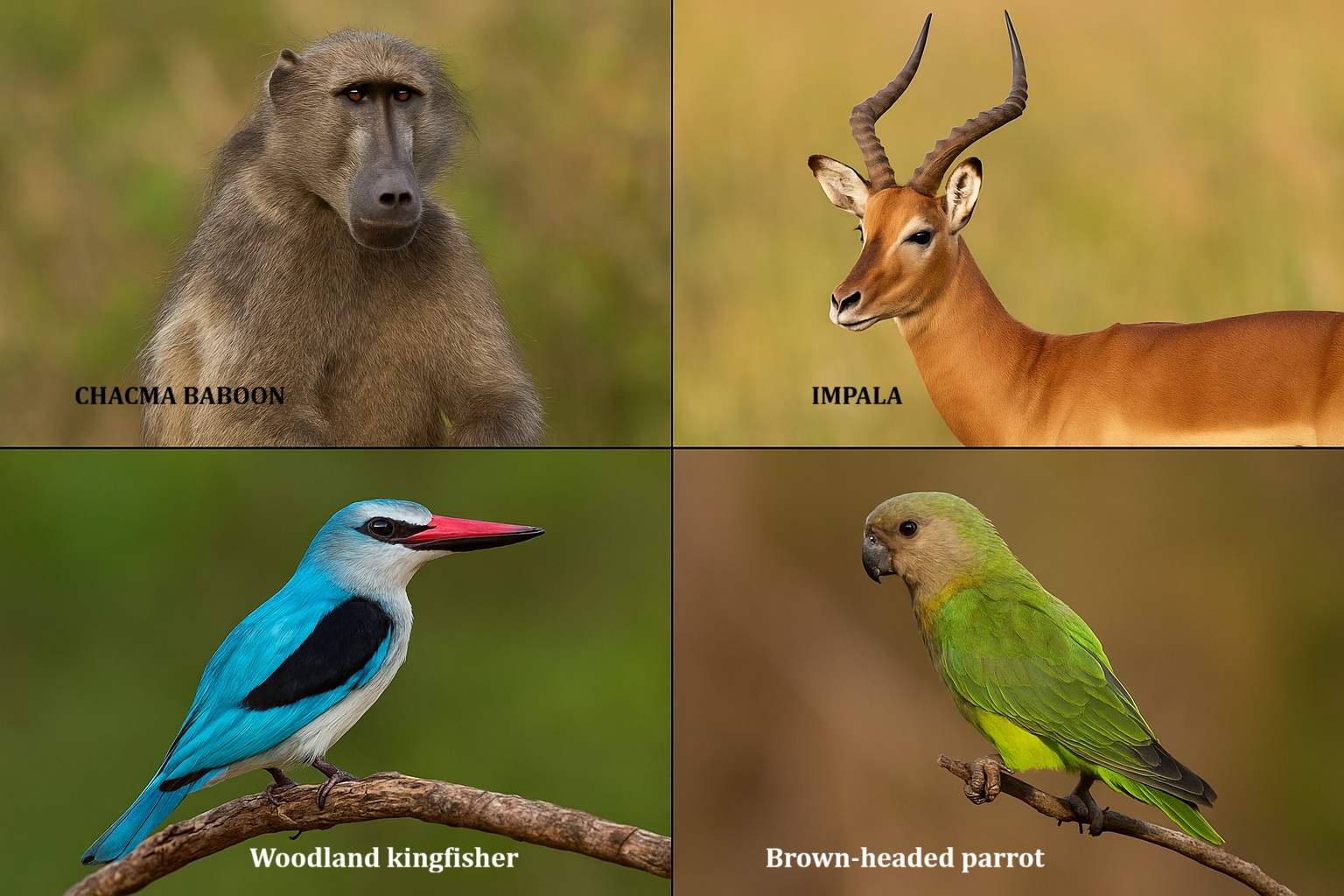 “The African bush has tall grass, trees, and animals like lions, elephants, and giraffes.”