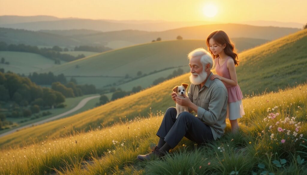 One quiet morning, Anna walked through a small road in the country with her dog. The sun was not up yet, and the air was quite cool. Upon arriving at the top of a little hill, she saw an old man sitting alone.