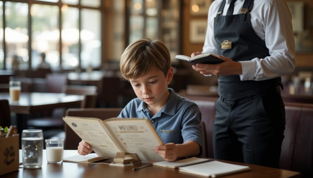 A boy sits at a table. He is looking at the menu. A waiter is standing beside him with a notebook and a pen.